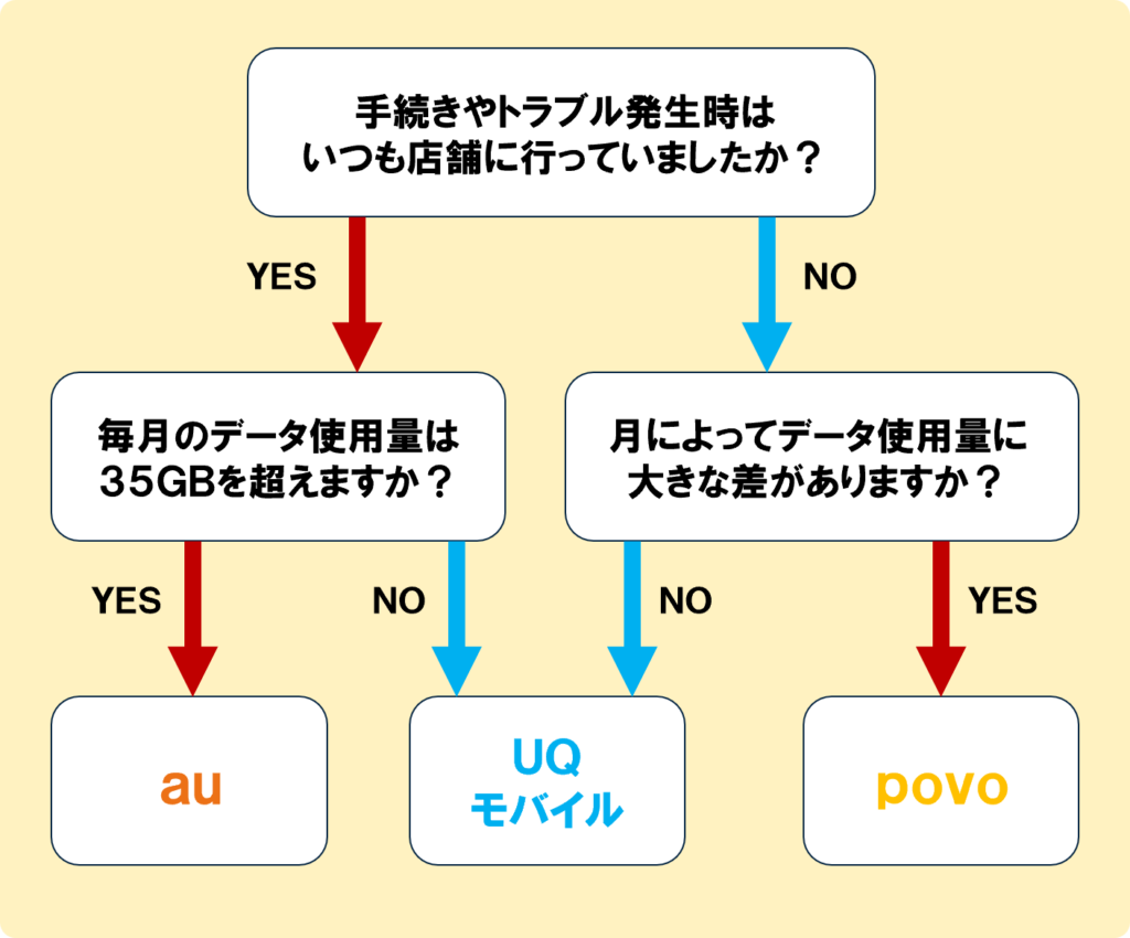 【フローチャート】UQモバイル・povo・auのどれが最適か判定